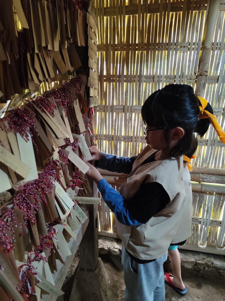 Setelah nama-nama mereka tertulis, satu lembar kami bawa pulang sebagai kenang-kenangan, satu lagi digantung di Bale Daja, salah satu bangunan penting di area Museum Pustaka Lontar. Di sinilah maknanya terasa lebih dalam. Dalam kepercayaan Hindu Bali, nama bukan sekadar identitas, melainkan doa. Ketika nama ditulis dan digantung, ia menjadi harapan, niat baik, dan permohonan yang diserahkan pada waktu.
