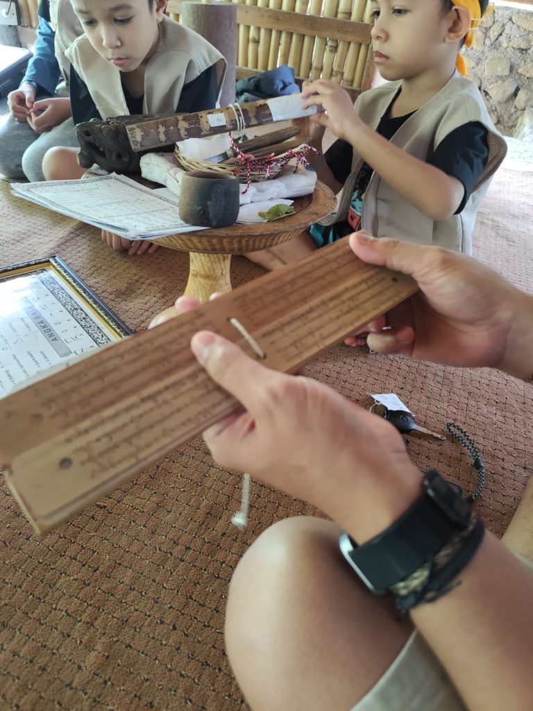 Setelah itu, permukaan rontal dibersihkan dengan tisu sampai permukaannya mengilap dan aksara yang semula samar perlahan muncul dengan jelas. Di titik itu, anak-anakku baru tersenyum lebar. Nama mereka akhirnya terlihat. Terukir dan tidak bisa dihapus sampai kapanpun.